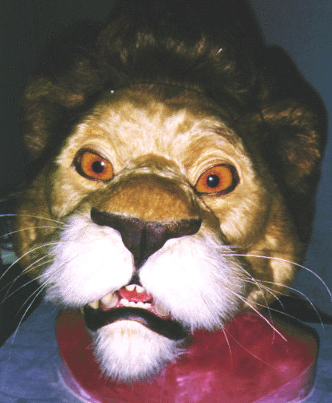 The picture at left shows the body performer, Dave Thompson, in the process of suiting up in the completed head and body for the very first time. Below is a picture of Livingstone's head on a stand (his mane still bunched up under hairnets!) during early rehearsals. Livingstone was built by Jim Henson's Creature Shop in London.
