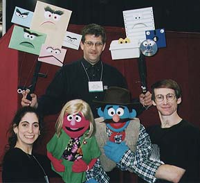At right, the cast of the show. Standing: Mike Schwabe, from Chicago, who performed the evil envelopes and incompatible data puppets; seated: at left, Carole Simms, who performed Linda, and at right, me, with Tex. The puppets were built by myself, Carole, Brad Pope, and Deborah Glassberg.