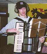 At left, recording my first accordion part. I don't really play accordion, but I have one sort of on permanent loan that I've been dying to use, so I wrote it into the score. To everyone's surprise, it sounded pretty good! Could I be more of a dork? | |