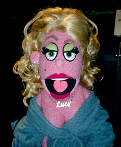 | At left, two of the characters I originated, Trekkie Monster and Nicky. Trekkie is an internet porn connosieur, and Nicky is a slacker and Rod's roommate. At right is AVENUE Q's resident floozy Lucy The Slut. Is that how you spell "floozy? | ||||